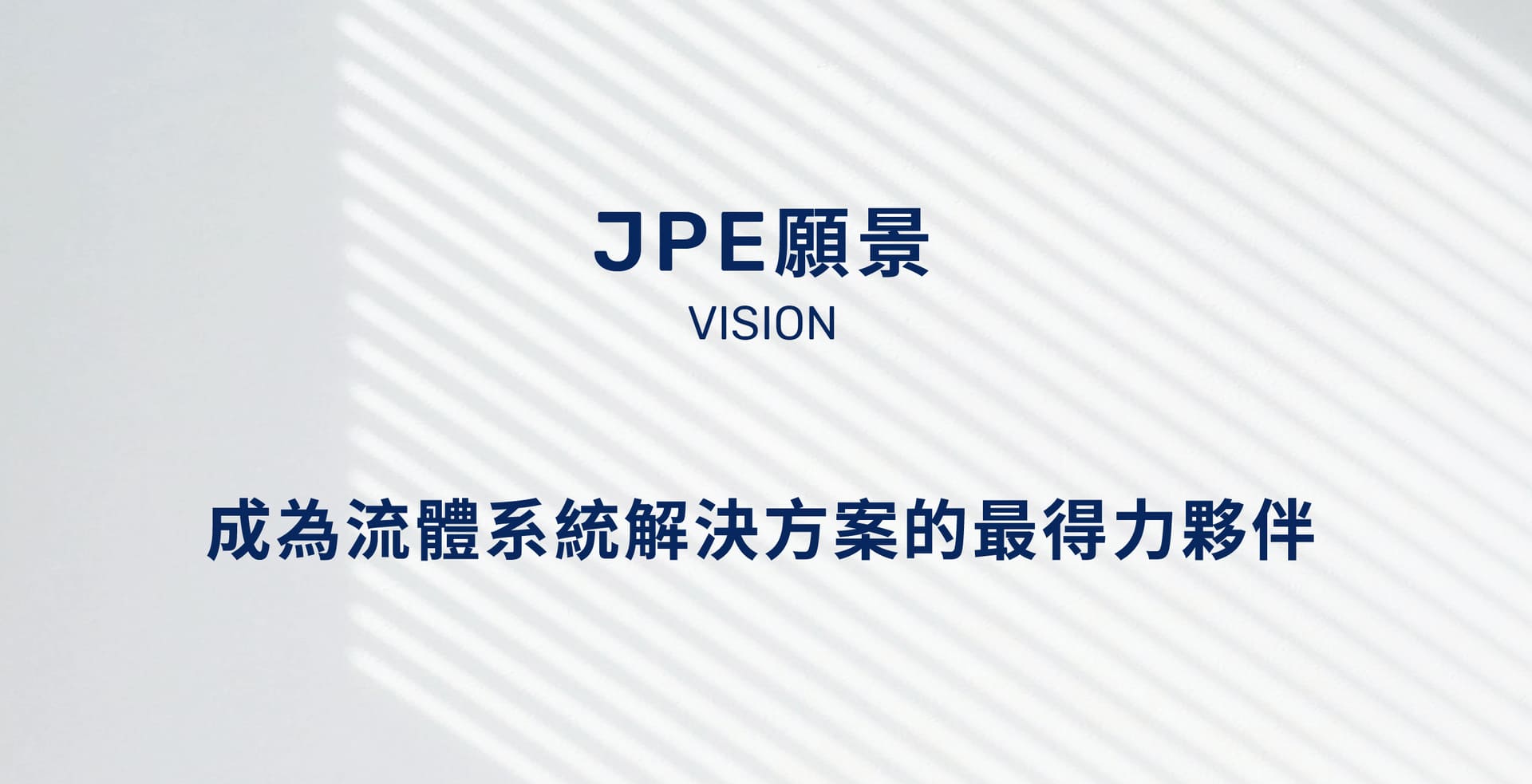 JPE的願景是成為流體系統解決方案的最得力夥伴。這是我們對市場和客戶的承諾,也是我們對自身的期許。無論現在還是未來,我們始終致力於以領先的技術與可靠的服務,成為客戶心中首選的合作夥伴。