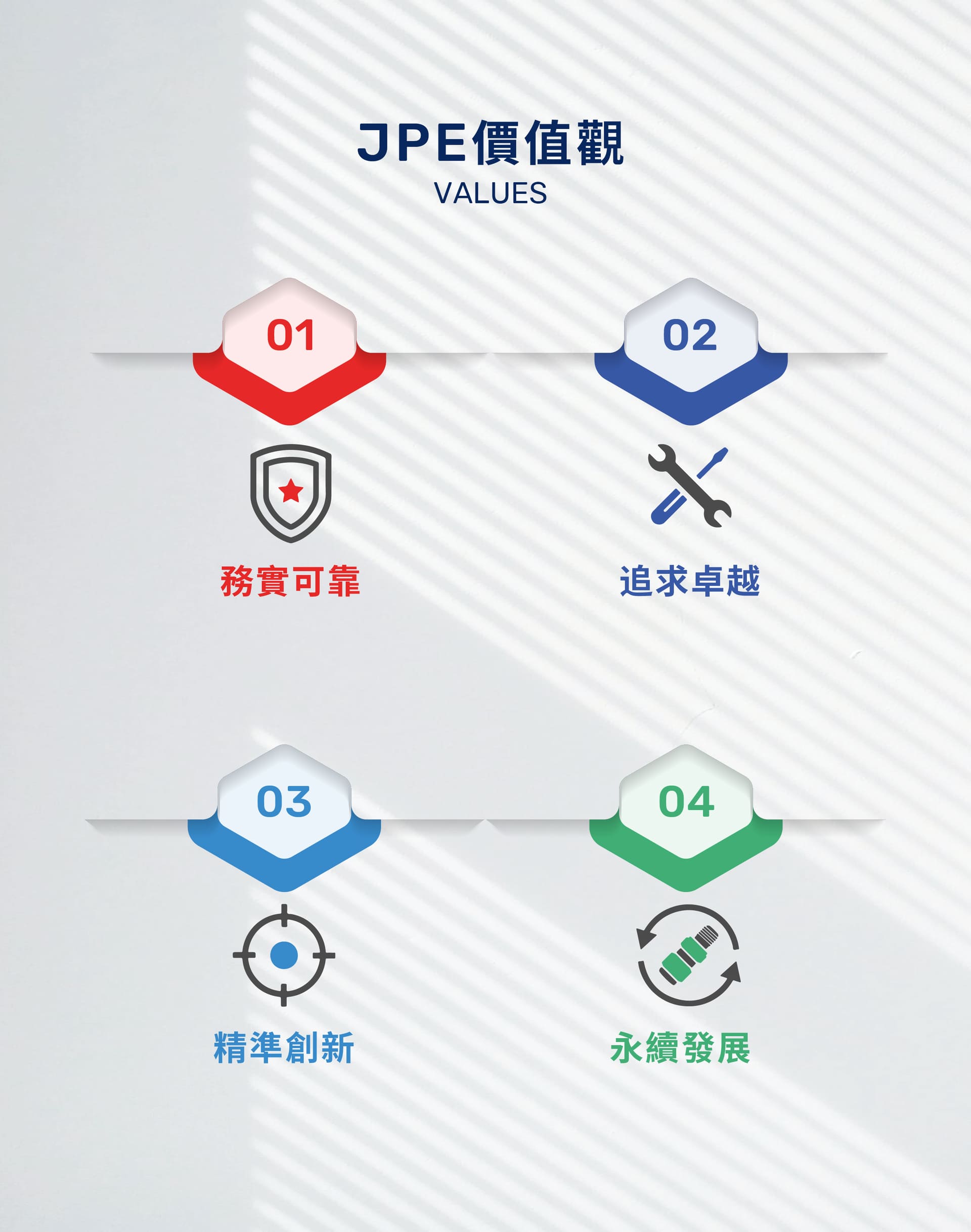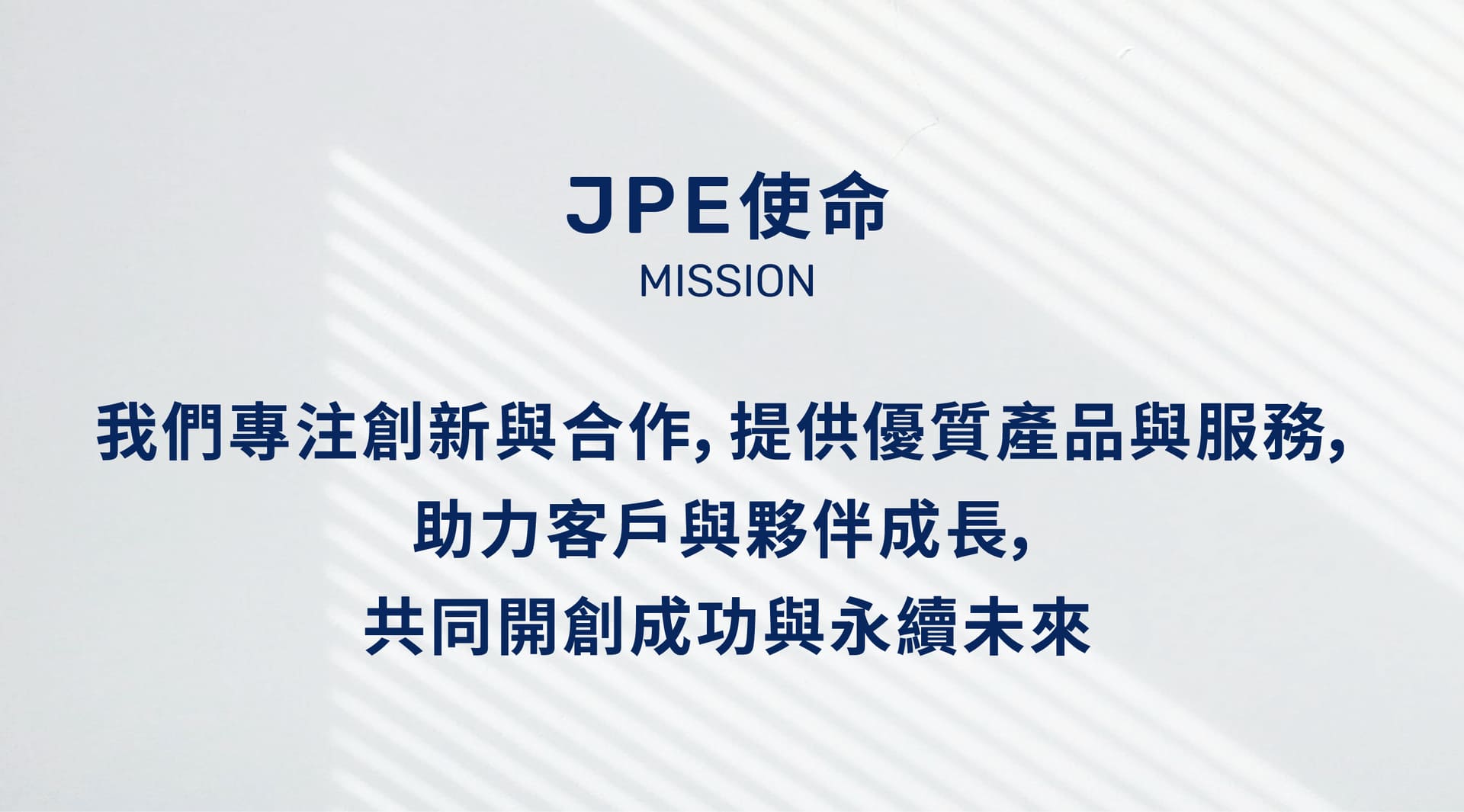 JPE始終堅守「務實可靠」的態度,重視實事求是,確保每一次的交付都值得信賴;在競爭激烈的市場中,我們以「追求卓越」為目標,不斷精進自我,保持領先;我們也秉持「精準創新」的精神,將創新視為解決客戶需求的關鍵動力;此外,我們承擔對環境、社會與未來的責任,以「永續發展」為核心,努力實現共存共榮。這些價值觀不僅是每位同仁在日常工作中的行動准則,也成為我們與客戶互動、產品交付時的基本標準,體現了JPE企業文化的深層內涵與實踐意義。